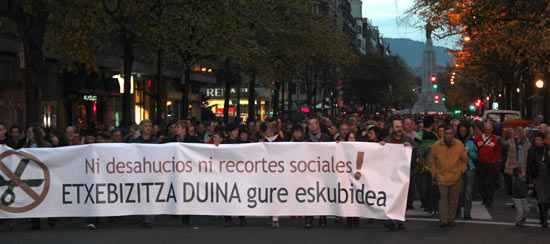 ELA, LAB, ESK, STEE-EILAS, EHNE, Hiru, CGT eta CNT sindikatuen eta hamarnaka eragile sozialen deialdiari jarraituz, milaka pertsona Bilbon elkartu dira etxe kaleratzeak eta murrizketak salatu eta etxebizitza duina izatearen eskubidea aldarrikatzeko.