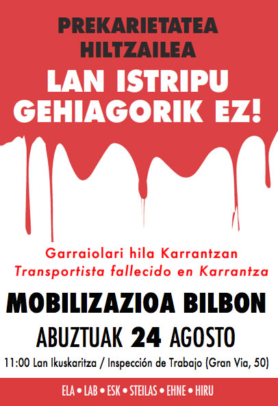 Atzo garraiolari batek bizia galdu zuen lanean ari zela Karrantzan. Lan munduan ematen den prekarietateak gure bizia arriskuan jartzen duela salatzeko eta istripu gehiago eman ez daitezen neurriak exijitzeko ELA, LAB, ESK, STEILAS, EHNE eta HIRU sindikatuok mobilizazioa egingo dugu abuztuaren 24ean Bilbon. Lan Ikuskaritzaren aurrean (Gran Via, 50) izango gara goizeko 11:00etatik aurrera "Prekarietatea hiltzailea. Lan istripu gehiagorik ez!" lelopean.