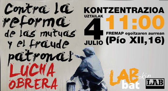 Gaur, hilak 4, Madrilgo ministro kontseiluak Mutuen erreformari bide emango dio; LABek erreforma honen kontrako jarrera argia adierazi nahi du eta horretarako goizeko 11:00etan Iruñean, FREMAPen egoitzan aurrean mobilizatuko da.
