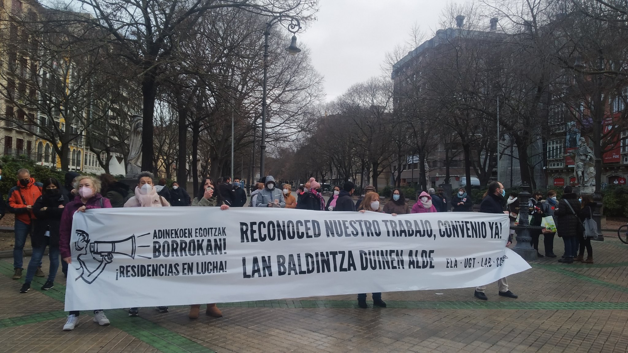 LAB, ELA, UGT eta CCOO sindikatuetako zenbait ordezkarik Iruñeko Parlamentuaren Eskubide Sozialetako Batzordean hartu dute parte, adinduen arretarako Nafarroako lehenbiziko hitzarmena izango denaren negoziazioak zertan diren azaltzeko. Horren karietara, lau sindikatuok elkarretaratzea egin dugu Parlamentuaren aitzinean. Protesta hau ostegunerako deitutako egun osoko grebaren atarian egin dugu.