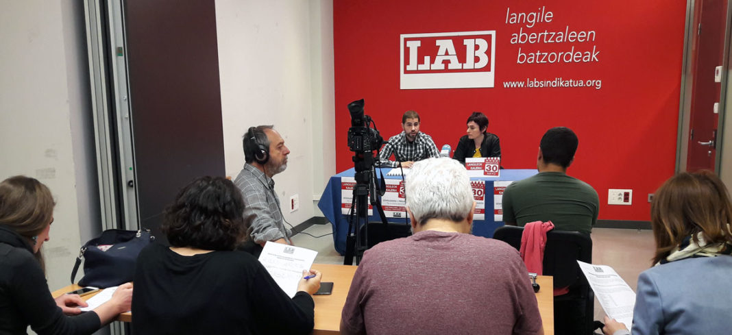 LAB sindikatuak lanuzte eta mobilizazio eguna deitu du maiatzaren 30erako, gutxi gorabehera 120.000 nafar langileren lan baldintzak okerragotzen dituen estatalizazio prozesu mantso baino etengabearen aurka. Espainiako estatuaren esku-hartzerik gabe, Nafarroako lan harremanak Nafarroan ezartzearen aldeko egin dute Garbiñe Aranburuk eta Imanol Karrerak Iruñean emandako prentsaurrekoan.