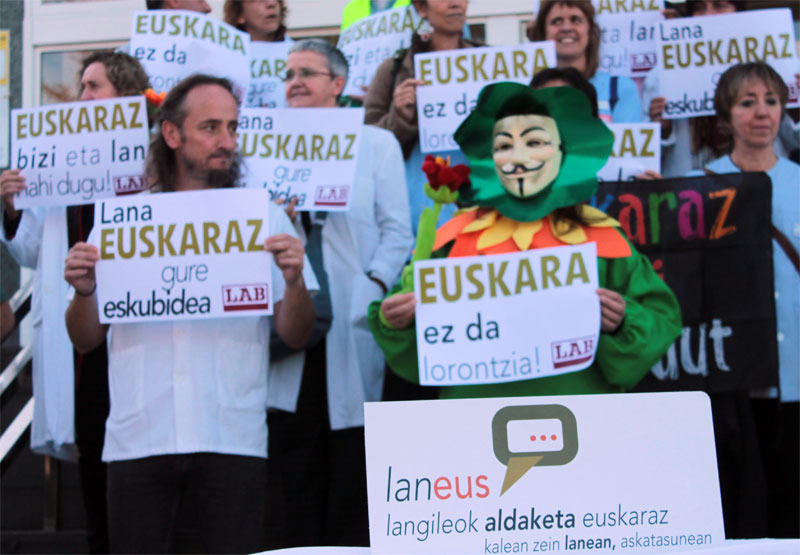 LAB sindikatuak Osakidetzako zuzendaritzak eta arduradun politikoek euskara lorontzi-apaingarri bezala erabiltzen dutela salatu dute gaur Donostiako Ospitalean. Osakidetzan ere euskaraz bizi eta lan egiteko eskubidea aldarrikatuz elkarretaratzea egin dute egoitzaren aurrean.
