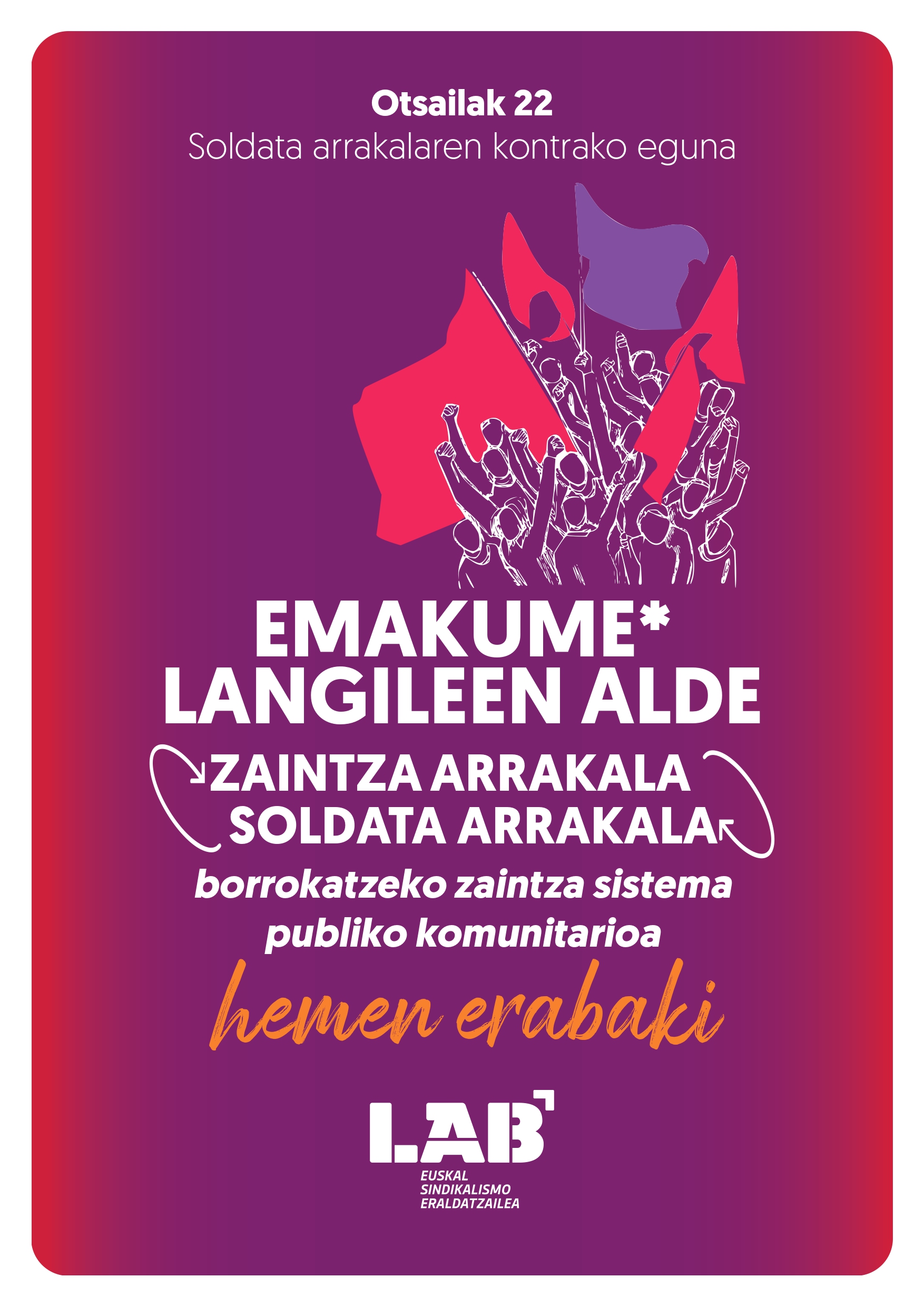 LAB sindikatutik bide horretan borrokan jarraituko dugu, lantokiz lantoki soldata arrakalaren kontrako neurriak borrokatzen, banaketa hirukoitzean (zaintza, enplegua eta aberastasuna) oinarrituko den sistema sozioekonomiko berri baten alde lanean. Bizitzak erdigunean kokatuko dituen eredu berri baterantz trantsizioa egiteko garaia da.