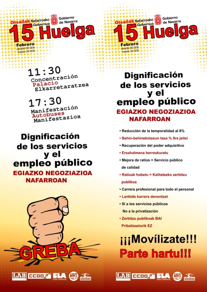 LAB, CCOO, ELA, UGT eta Steilas sindikatuok prentsaurrekoa eman dugu Iruñean, iragartzeko otsailaren 15eko Osasunbideko greba ez dela bakarrik Osasunbidekoa izanen, foru administrazio osokoa baizik.