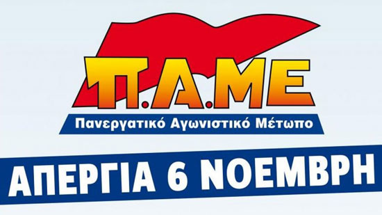 Greziako PAME sindikatuak Greba Orokorra deitu du gaur azaroak 6, eskubide laboral eta sozialen alde. Izan ere, gaur eguneko krisi kapitalistaren testuinguruan, Europar Batasuneko enpresario eta gobernuak Troikarekin batera oinarrizko eskubide laboral eta sindikalak erasotzen ari dira.