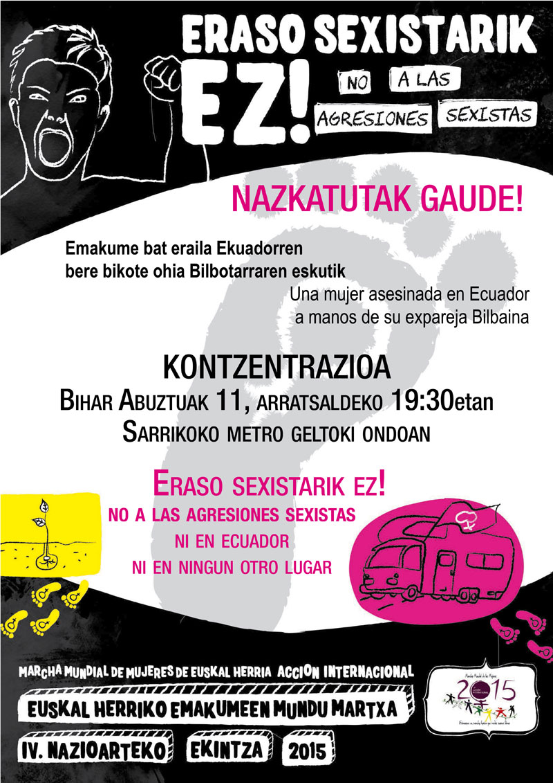 Indarkeri sexistaren aurkako borrokan agente sozial, politiko eta instituzional guztien ardura pertsonal eta kolektiboa ezinbestekoa da, hezkuntzan hasita beste edozein eremutan ere. Garaia da hitzetatik praktikara pasatzeko. Horregatik Euskal Herriko Emakumeon Mundu Martxako plataformatik deituta, Paola Moromenachoren erailketa sexista salatzeko mobilizazioan parte hartuko dugu bihar, abuztuaren 11n, arratsaldeko 7:30etan Sarrikoko metro geltokian. Atzo jakin genuen, Paola Moromenacho Ekuadorren eraila izan zela bere bikote ohia zen Hector Menchero Bilbotarraren eskutik.