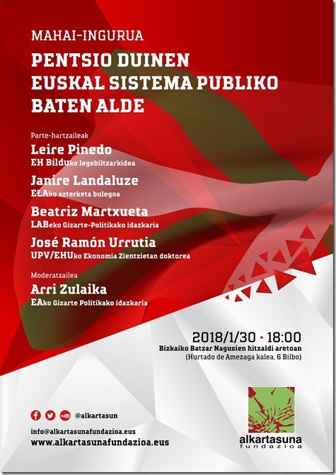 Alkartasuna Fundazioak mahai inguru bat antolatu du astearterako, "Pentsio duinen euskal sistema publiko baten alde" leloarekin. LABeko Ekintza Sozialeko idazkari Bea Martxuetak hartuko du hitza, EH Bilduko legebiltzarkide Leire Pinedo, ELAko ordezkari Janire Landaluze eta EHUko irakasle Jose Ramon Urrutiarekin batera. Bizkaiko Batzar Nagusien hitzaldi aretoan egingo dute solasaldia, 18:00etan.