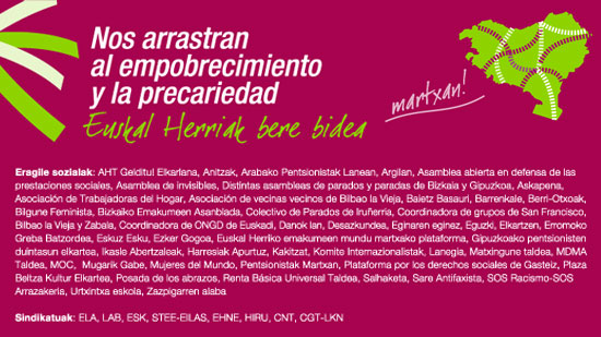 Euskal Herriko eragile sozial eta sindikalek pobreziaren kontrako mobilizazio kanpainaren baitan, datorren Martxoaren 10etik 22ra Hego Euskal Herria gurutzatuko duen martxa burutuko dute. Ekimenak pobreziari kontra egiteko neurriak exijitzea eta bide horretan konpromiso instituzional argi bat lortzea du helburu. Martxari Ermuan emango zaio hasiera martxoaren 11n eta Iruñean amaituko da martxoaren 20an.