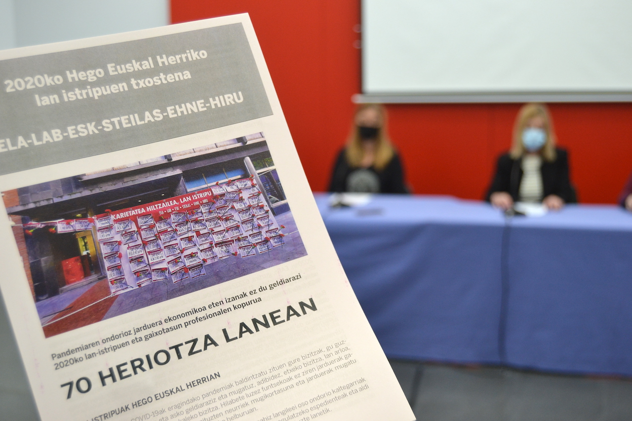 Koronabirusak jarduera ekonomikoa murriztu arren, 2020an 70 pertsona hil ziren lan-istripuz Hego Euskal Herrian. Pandemiak agerian utzi du laneko segurtasun eta osasunera bideratutako baliabide publikoak ez direla nahikoak. Halaxe salatu dugu euskal gehiengo sindikala osatzen dugun LAB, ELA, ESK, STEILAS, EHNE, HIRU eta CGT sindikatuok egindako agerraldian.