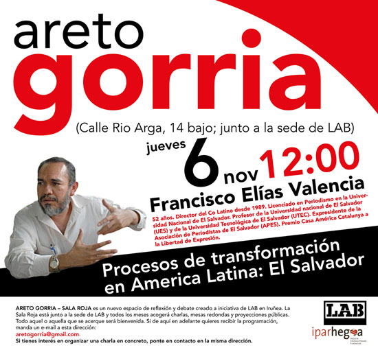 Datorren ostegunean, hilak 6, Francisco Elías Valencia kazetaria El Salvadorren ematen ari den aldaketa prozesuaz arituko da Iruñeako Areto Gorrian. 52 urte ditu Elías Valenciagak eta Co Latinoko zuzendaria da 1989tik. Casa Ámerica Catalunya a la Libertar de Expresión saria jasotakoa da.