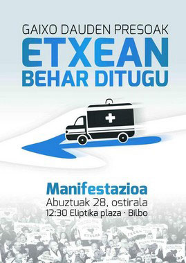 Gaixo dauden Bizkaiko euskal presoen senide eta lagunek manifestazioa antolatu dute datorren abuztuaren 28rako Bilbon. "Gaixo dauden presoak etxean behar ditugu" lelopean osasun eskubidea urratzen duen espainiar zein frantziar estatuen espetxe politika salatuko da. LABek bat egiten du mobilizazioen ardarrikapenekin eta Euskal Herriko langilegoari dei egiten dio bertan parte hartzera.