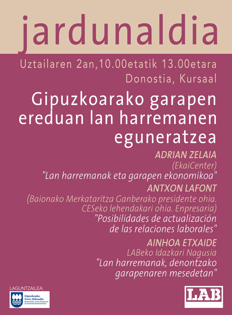 Datorren ostegunean LAB sindikatuak antolatuta Gipuzkoako garapen eredua eta lan harremanak aztertzeko jardunaldia burutuko da Donostiako Kursaalen. Jardunaldian Adrian Zelaia (EkaiCenter), Antxon Lafont (Baionako Merkataritza Ganberako presidente ohia, CESeko lehendakari ohia eta enpresaria) eta Ainhoa Etxaidek (LABeko Idazkari Nagusia) parte hartuko dute. Zelaiak lan harremanak eta garapen ekonomikoa izango du aztergai, Lafontek lan harremanak eguneratzeko aukerak eta Etxaidek "denontzako" garapenaren mesedetan lan harremanak duten garrantzia azalduko du. "Gipuzkoarako garapen ereduan lan harremanen eguneratzea" jardunaldiari goizeko 10:00etan emango zaio hasiera.