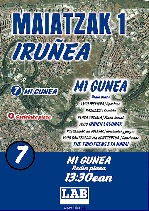 Festarako tartea ere egongo da Maiatzaren Lehenean. Hain zuzen ere, berritasun gisa, M1 Gunea deitutako eremua egokituko dugu Iruñeko Redin plazan, mobilizazioen ondorengo topagune gisa. Heldu eta haurrentzako jarduerak egingo ditugu bertan, borroka eta lana ere ospatu beharra dagoelako. 13:30etik aurrera egongo da zabalik M1 Gunea.
