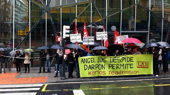 El sindicato LAB ha realizado en el día hoy una cadena humana delante del edificio de cristal de Sanidad en Bilbao para denunciar el despido de Carlos Díaz Zubia delegado de este sindicato en Ambulancias Bizkaia, exigir su readmisión y señalar al Departamento de Sanidad como parte colaboradora necesaria en las decisiones que se toman en sus subcontratas, amparando la persecución sindical.