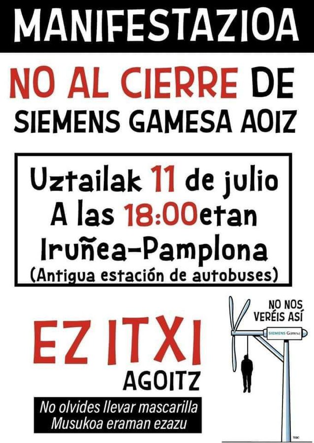 Bere egunean, enpresaren kontrola galduz Gamesa Siemensi saldu izana txalotu zutenen erantzukizun politikoaren ordua da. LABetik dei egiten diogu gure militantzia osoari eta baita nafar jendarteari ere enpresa-batzordeak datorren larunbatean deitu duen manifestazioan parte hartzera. Uztailaren 11an izango da, 18:00etan, autobus geltoki zaharretik abiatuta. Itxiera hau gelditu egin daiteke. Guztion artean lortuko dugu.