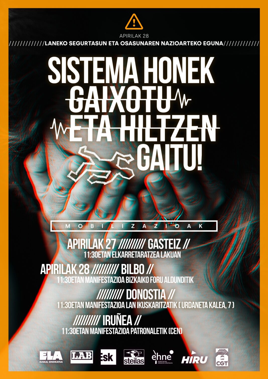 Urtero legez, euskal gehiengo sindikalak deituta, Hego Euskal Herriko hiriburuetan mobilizatuko gara egun horren bueltan: Gasteizen, apirilaren 27an, 11:30ean, Lakuan; eta apirilaren 28an bertan, Bilbon, 11:30ean, Bizkaiko Aldunditik abiatuta; Donostian, 11:30ean, Lan Ikuskaritzatik; eta Iruñean, 11:30ean, CEN patronaletik.