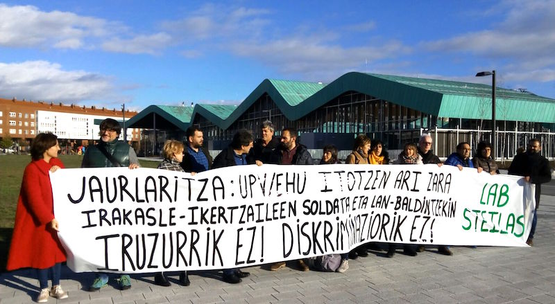 Soldata eta lan-baldintza duinak irakasle eta ikertzaile guztiontzat, horixe aldarrikatu dugu gaur LAB eta STEILAS sindikatutako ordezkariok Lakuako atarian, Euskadiko Unibertsitate Kontseiluaren eta Unibertsitate Irakaskuntza Publikoa Koordinatzeko Kontseiluaren bilera aurretik.