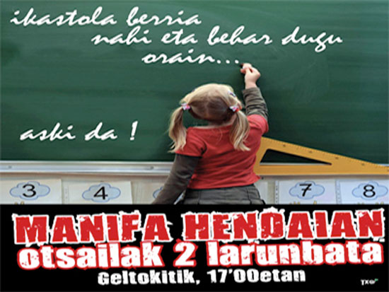 LAB sindikatuak Baionako suprefetak Udalari ikastola diruz laguntzea debekatuz igorritako gutuna arbuiatzeko Seaskak, Ipar Euskal Herriko ikastolen Elkarteak, biharko, otsailak 2, Hendaian deitutako manifestazioarekin bat egin eta Euskal Herritatar orori bertan parte hartzera dei egiten die. Manifestazioari 17.00etan emango zaio hasiera tren geltokitik "Ikastola berria nahi dugu eta behar dugu orain… aski da!" lelopean.