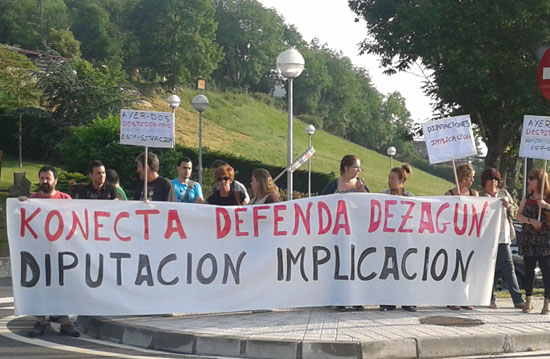 Hoy jueves día 28 de junio, como cada año, las Juntas Generales de Bizkaia se han trasladado a la casa de Juntas de Abellaneda en Enkarterri para celebrar su última sesión antes del período estival. Ante esta cita, las trabajadoras de Konecta han recibido a los junteros y junteras a su llegada, para reclamarles implicación y la defensa de esta planta desde esta institución.