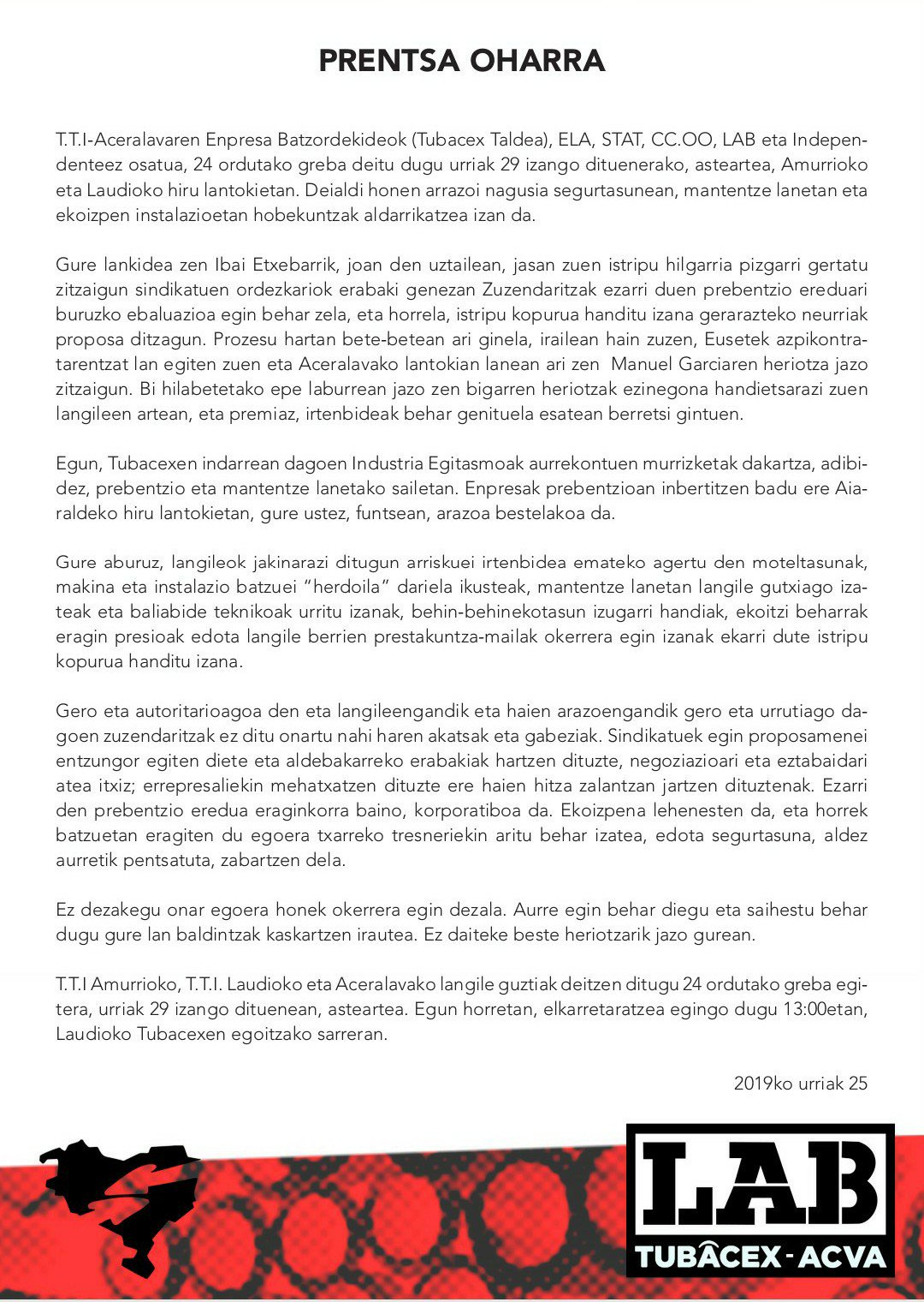 T.T.I-Aceralavaren Enpresa Batzordekideek (Tubacex Taldea), LAB, ELA, STAT, CC.OO eta Independenteez osatua, 24 ordutako greba deitu dute urriaren 29rako, Amurrioko eta Laudioko hiru lantokietan. Deialdi honen arrazoi nagusia segurtasunean, mantentze lanetan eta ekoizpen instalazioetan hobekuntzak aldarrikatzea da.