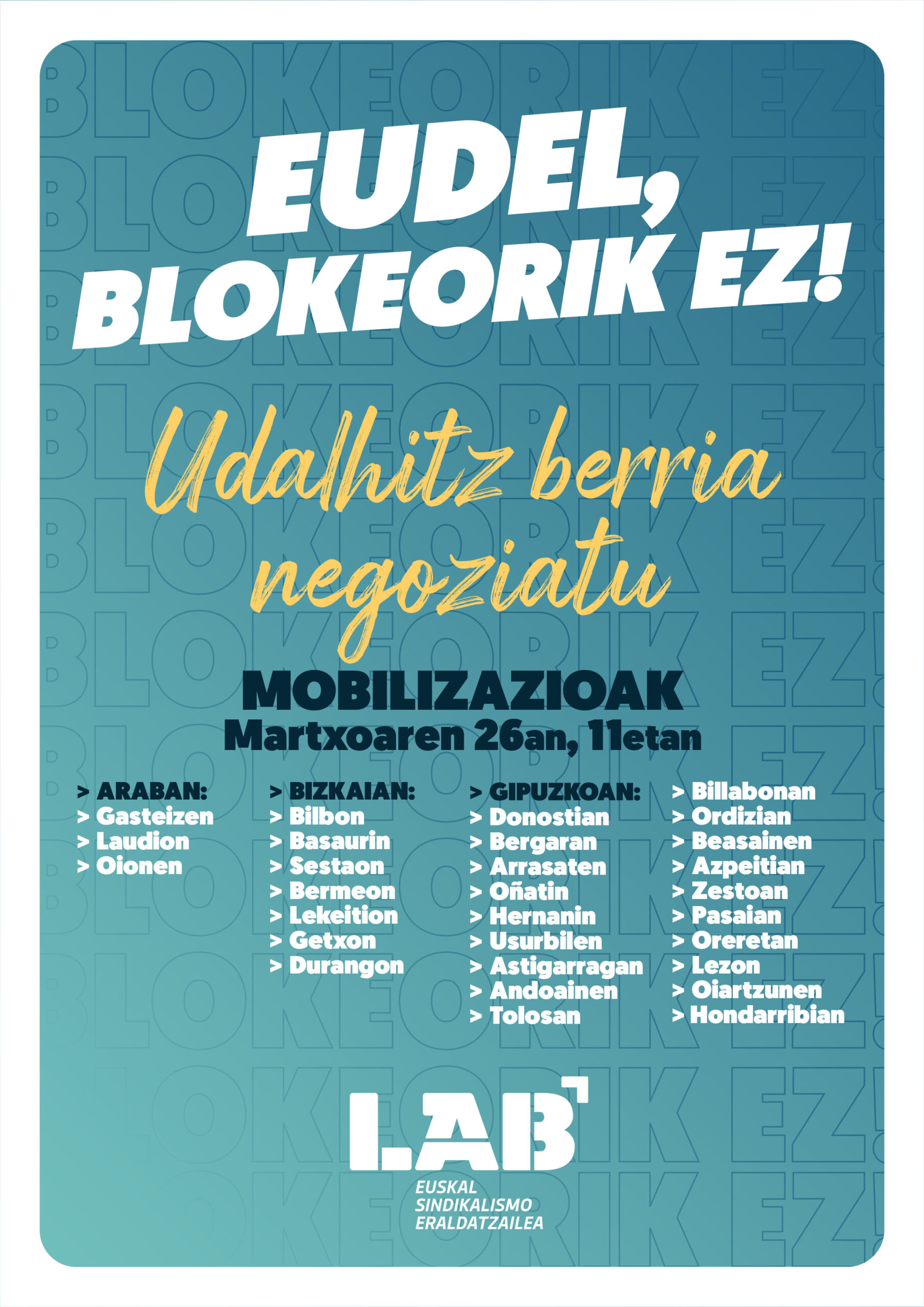 Udalhitzen negoziazioa blokeatuta dago, eta azarotik hona ez da izan aurrerapauso nahikoa. Horregatik, martxoaren 26rako mobilizazioak deitu ditu LABek, eta apirilaren 17rako eta 23rako lanuzteak.