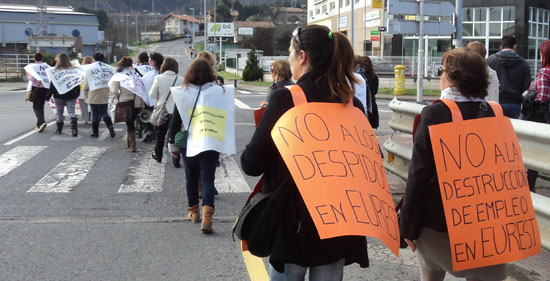 Eurest enpresako langileek Deriotik lantegiko atariraino zutabea egin zuten atzo enplegu suntsiketaren aurkako dinamikaren baitan. Eurest-k enplegua suntsitzen jarraitzen duela salatu eta mobilizazio berriak iragarri zituzten bertan.