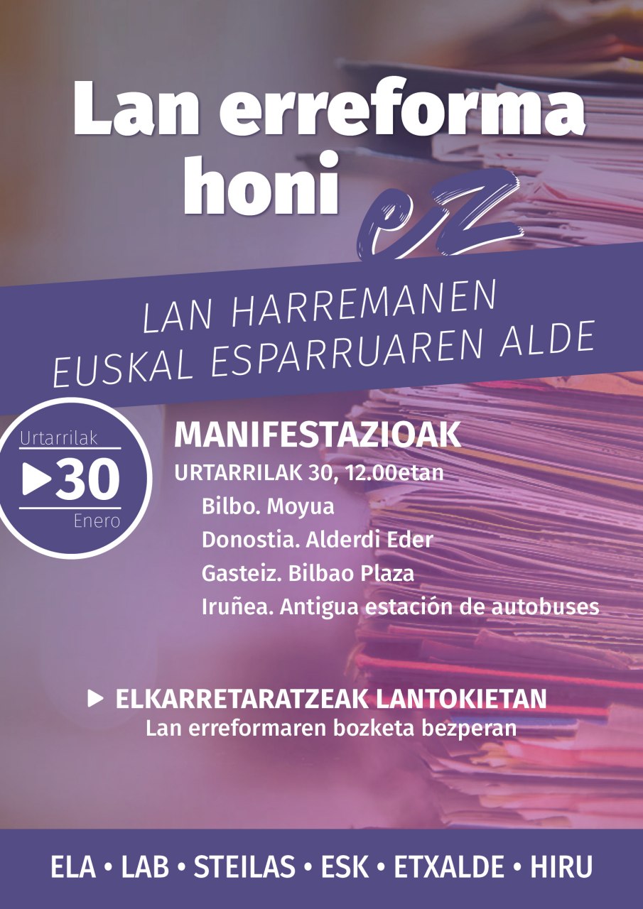 Urtarrilaren 30ean manifestazioak egingo ditugu hiriburuetan, euskal gehiengo sindikalak deituta, lan erreforma errefusatu eta lan harremanen euskal esparrua defendatzeko