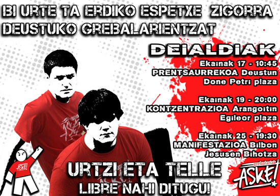 Telle eta Urtziren berehalako espetxeratzea dela eta, bihar ekainak 17, Grebalariak Aske! plataformak prentsaurrekoa emango du Deustun, 10:45ean Done Petri plazan. Ekainaren 19rako konzentrazioa deitu dute Arangoitin eta 25ean manifestazioa izango da Bilbon.