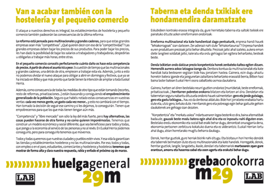 En el pequeño comercio conocéis perfectamente cuánto daño os hace esta competencia de precios. A partir de ahora el asunto irá a peor. Es cuestión de tiempo que las multinacionales y grandes cadenas, una detrás de otra, empiecen a trabajar esta vía. Además, junto a esto no podemos olvidar el nuevo ataque para obligar a abrir en domingos y festivos, que ya se ha iniciado en Bilbo y que más pronto que tarde tienen la intención de ampliar a toda Euskal Herria.