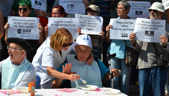 «1+Publikoa» kanpainaren baitan, LAB sindikatuak EAE zein Nafarroako zahar-egoitzetako adineko pertsonei ematen zaien arretaren kalitatea ez dela behar bezalako salatu zuen atzo Bizkaiko Aldundiaren aurrean. Zahar-egoitzetan egun ematen den errealitatearen parodia bat antzeztu zuten sindikatuko hainbat kidek.