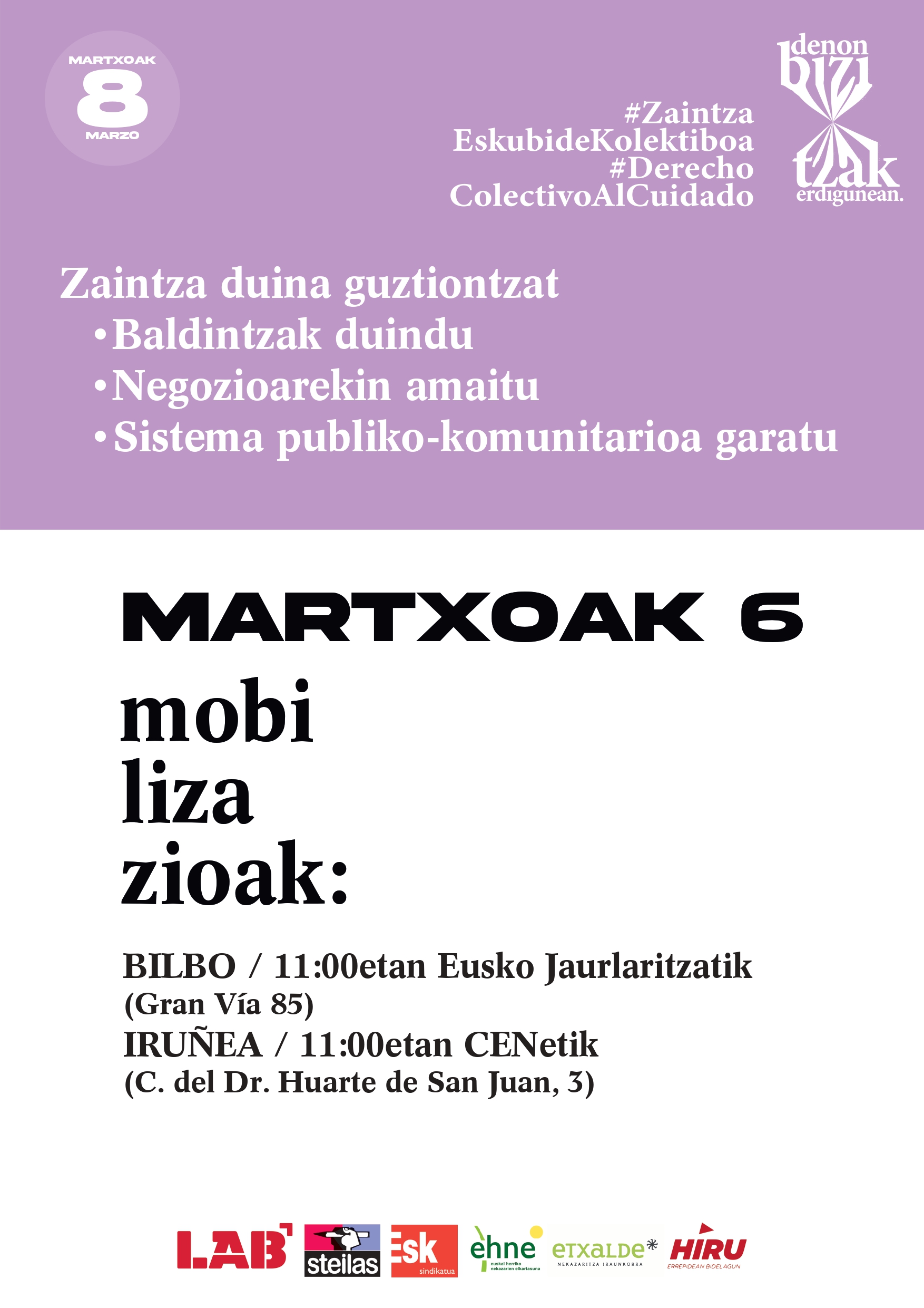 Borroka sindikal eta sozialaren bidez, zaintzen egungo antolamendu soziala eraldatzeko borrokan jarraitzen dugu: euskal zaintza sistema publiko eta komunitarioaren bidean, epe ertaineko erronka horretarantz urratsak ematen jarraitu ahal izateko aliantzak eta konpromisoak garatzen. Horregatik, martxoaren 6an, Greba Feminista Orokorrean egin genuen bezala, kaleak hartuko ditugu Bilbon eta Iruñean, eta patronala zein instituzioak interpelatuko ditugu.