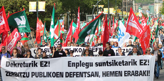 Funtzio publikoko mahai orokorrean ordezkaritza duten sindikatuek deituta (ELA, LAB, CCOO eta UGT) zerbitzu publikoetako milaka langile irten ziren kalera pasa den larunbatean lanaldia luzatzen duen Urkulluren goberbernuaren dekretuaren kontra eta zerbitzu publikoen defentsan. LABeko Zerbitzu Publikoen Federazioko Idazkari Arantxi Sarasolak mobilizazio honetarako lortutako batasun sindikala azpimarratu eta dekretuak ezartzen duen lanaldi luzapenak 2.000 lanposturen galera ekarriko duela salatu zuen.